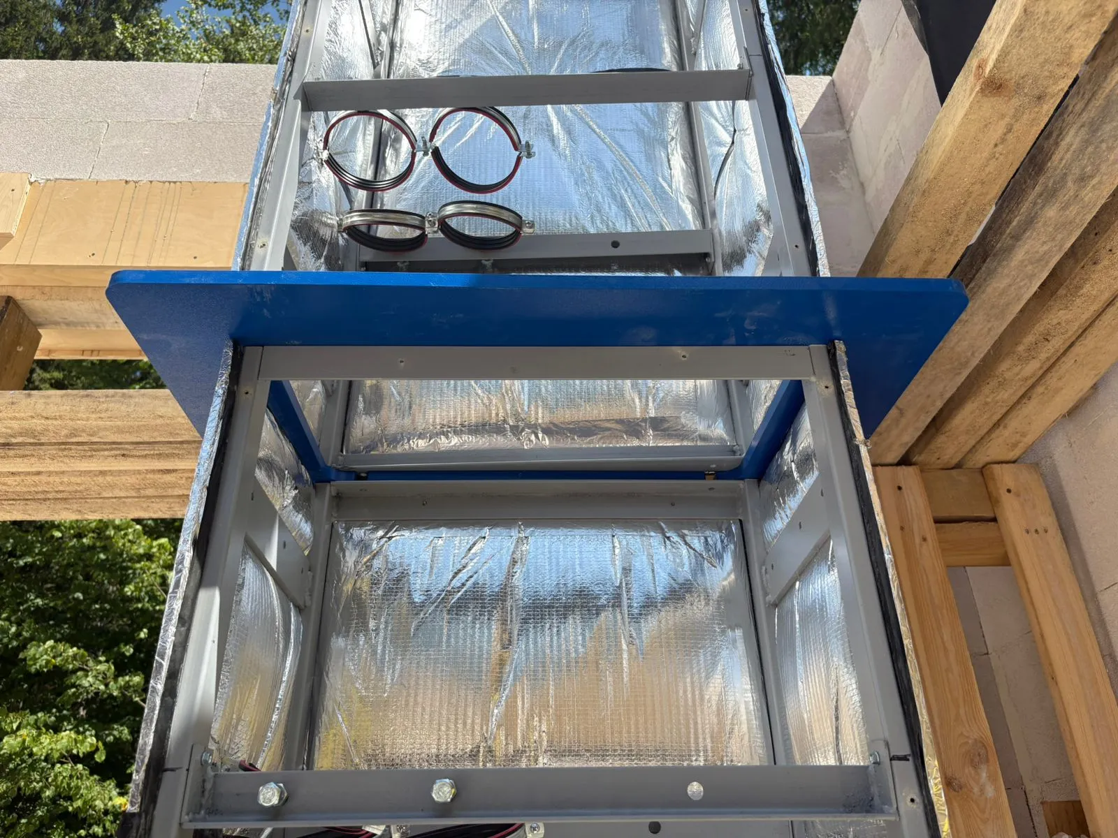 «КЛИК-ШАХТА» выполнена по каркасной технологии. Сварной каркас изготовлен из стальной трубы 40×20×2,5 и уголка 40×3, с раскосами из уголка, крепящимися саморезами к стойкам. На раскосах установлены хомуты для вентиляционных линий.